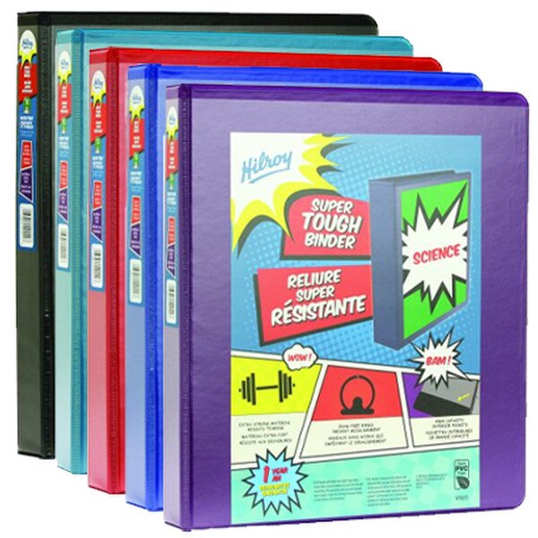 The Hilroy Super Tough 1 Inch Binder is tough tested to stay in great shape throughout the year. The extra strong material resists spine tearing while the spine design adds extra durability. This binder features high capacity interior pockets to keep loose papers from falling out and snag-free rings. The clear front overlay allows for customization. Guaranteed to last all year! Hilroy products not only represent your style and personality, they are built to last. 1 inch heat sealed binders are tough tested to stay in great shape throughout the year. Spine design adds extra durability, extra strong material resists spine tearing. High capacity interior pockets secure loose papers and keep them from falling out. Clear front overlay for added customization; Snag-free rings prevent misalignment. Holds 175 sheets of paper and is guaranteed to last all year. (Colour randomly selected at time of fulfillment)