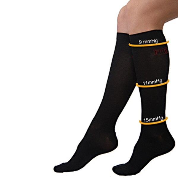 Two pairs in each package. SM/MED fits Women's shoe sizes 6-9 and Men's shoe sizes 5-8. Large/X-Large fits Women's shoe sizes 10-13 and Men's shoe sizes 9-12. Reduces ankle and leg swelling, increases circulation, prevents fatigue. Lycra spandex for comfort. Mild compression 8-15 mmHg. 95% Polyester, 5% Lycra.